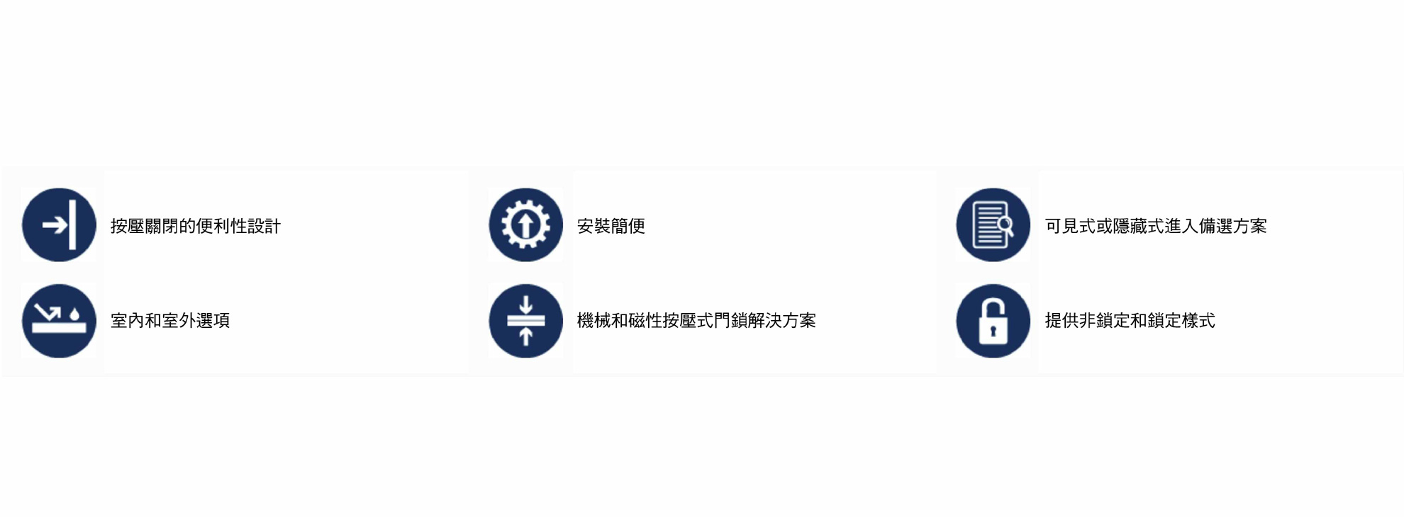 Southco按壓式門鎖操作便捷,只需撞擊一下即可輕鬆關閉門板,同時將其牢固地固定。按壓式門鎖解決方案安裝簡便,提供可見式安裝和隱藏式安裝選項,適用於各種尺寸、設計和驅動選項的室內和室外重載應用。